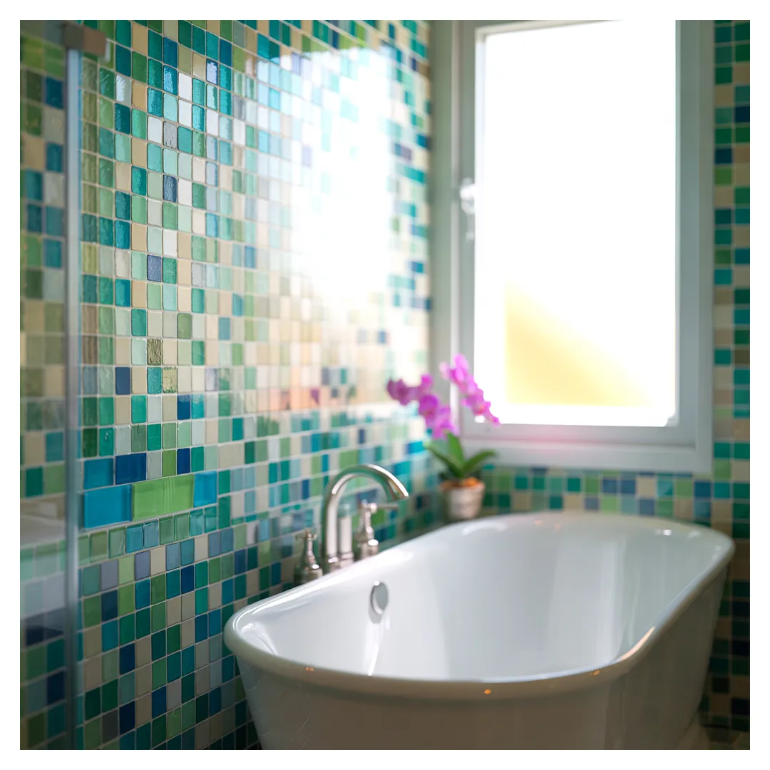 Jó választás lehet, ha nagyobb felületet burkolunk mozaikokkal. Az eredmény akkor lesz harmonikus, ha más színt és díszítést már nem alkalmazunk. Még látványosabb a hatás, ha a zuhanyzó vagy a kád előlapja helyett épített és mozaikkal burkolt részeket készíttetünk.