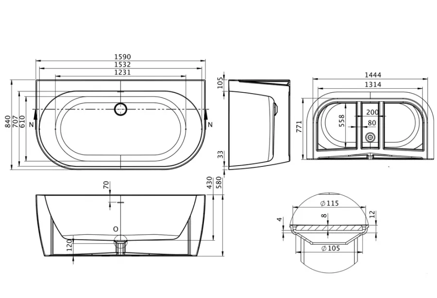New Velvet különleges akril kád 160x85 fehér előlappal, króm lefolyóval