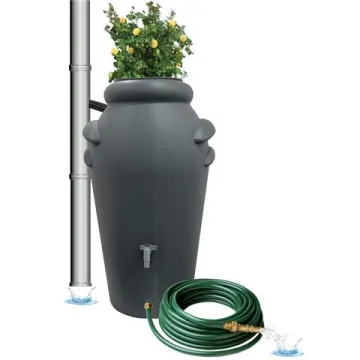 Uv stabil, polietilén műanyagból gyártott esővízgyűjtő szürke színben. A csomag tartalmazza a 3/4 colos csapot. A hordó teteje zárható, ezért kevésbé párolog a hordóban az összegyűjtött esővíz, de a tartály felső részén egy kivehető füles műanyag kaspóvödör is található, melybe növény ültethető. A hordó csapja lehetővé teszi a víz átfejtését vödörbe vagy kannába. A esővízgyűjtés környezetbarát módja a kerti növények öntözésére.