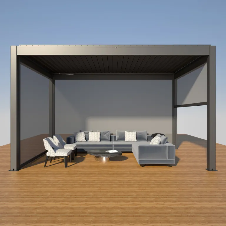 A pergolákhoz kapható oldalárnyékoló, mely további védelmet biztosít a napsugarak ellen és még inkább hozzájárul a magánszféránk érzetének fokozásához.